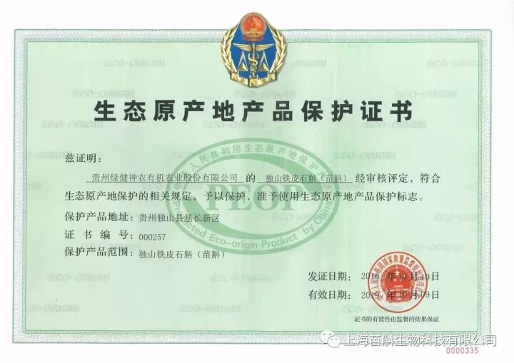 苗斛·铁皮石斛已通过【 欧盟有机认 证 】、【 日本有机认证 】、【 中国有机产品认证 】 、【 中国森林食品 认证 】 , 并获得了国家质检总局颁发的【 生态原产地保护产 品 】 。